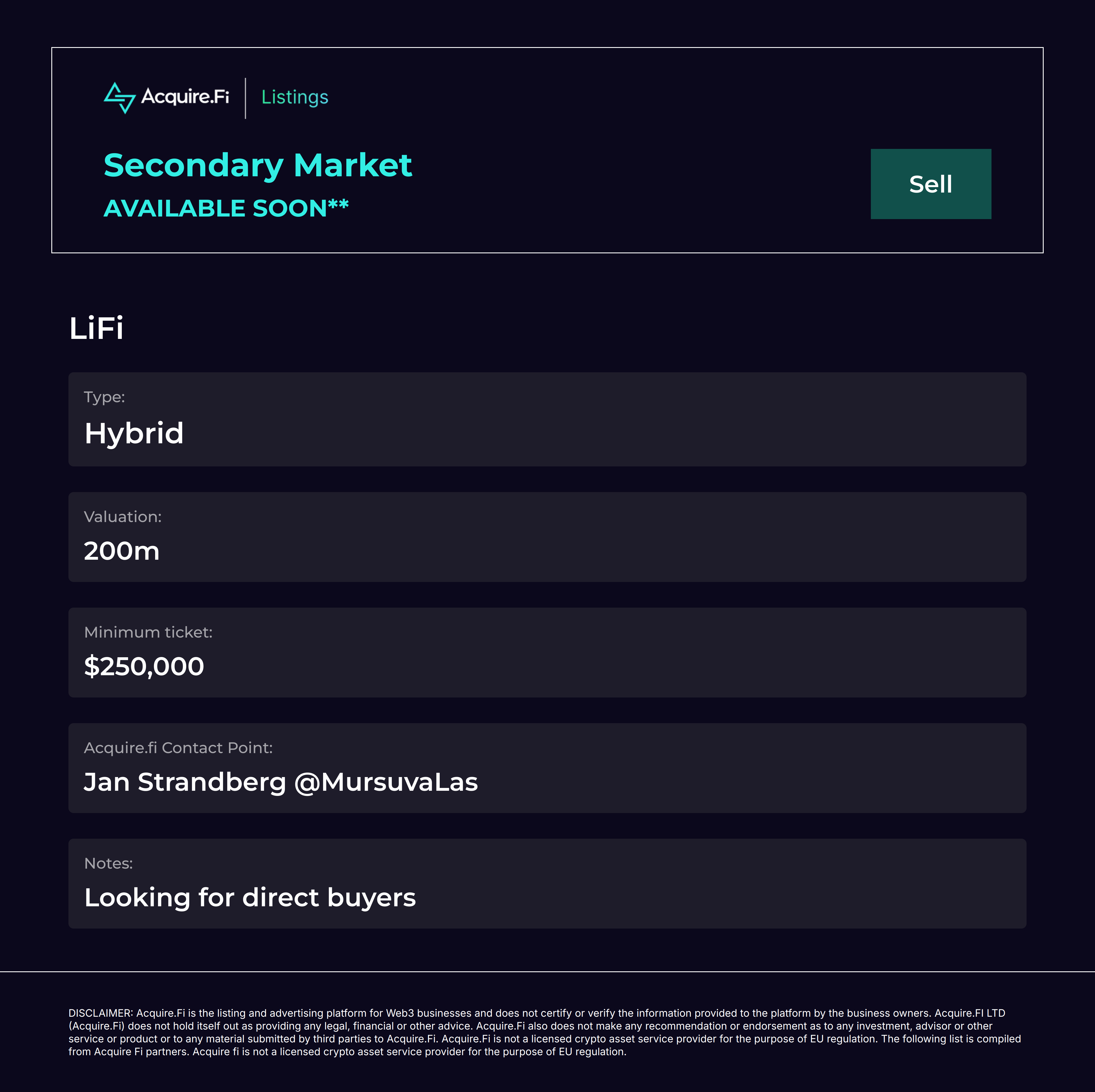 Secondary Market Sell: LiFi